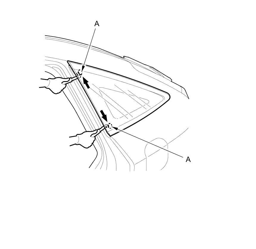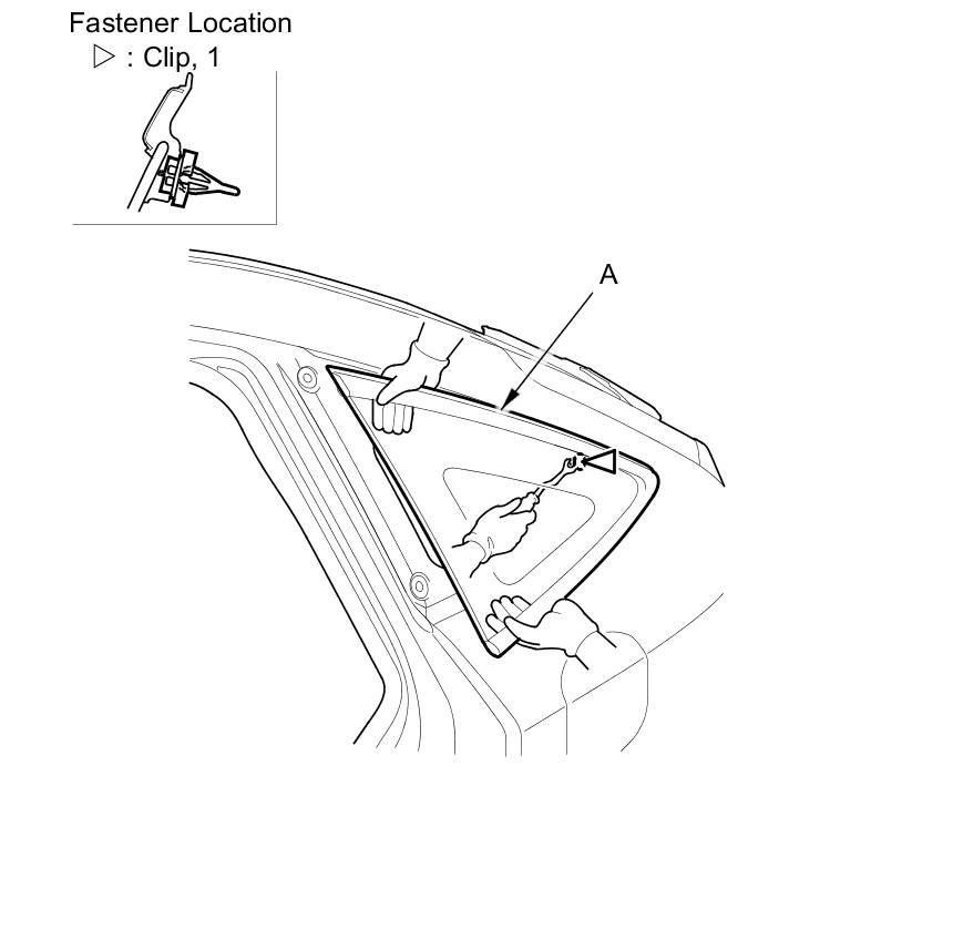 5. With an assistant holding the quarter glass (A), detach the clip with a clip remover from inside the vehicle, then carefully remove the quarter glass.