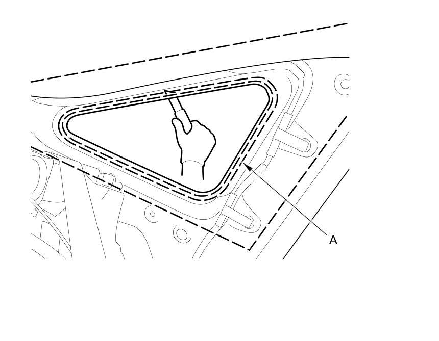 4. From inside the vehicle, cut through the adhesive (A) of the quarter glass with a utility knife.