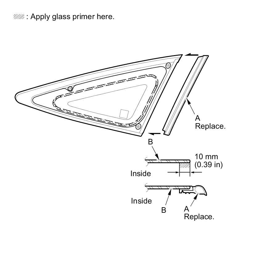 9. Attach the new front seal (A) with adhesive tape to the inside face of the quarter glass (B) as shown. Before installing the front seal, apply primer to the inside face of the quarter glass.