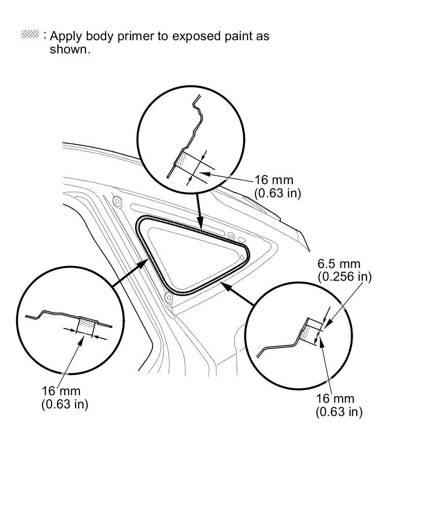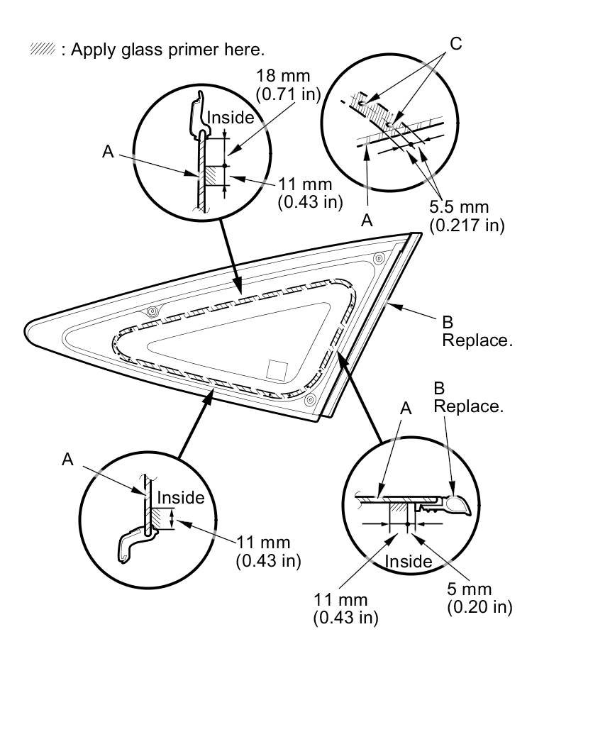 - Apply the glass primer to the rear corner, upper corner, and lower corner area of the quarter glass using the printed dots (C) on the quarter glass as a guide.