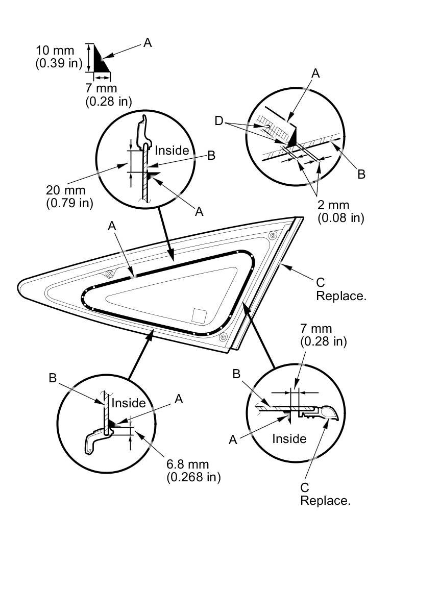 13. Put the cartridge in a caulking gun, and run a continuous bead of the adhesive (A) around the quarter glass (B) and along the front seal (C) as shown: