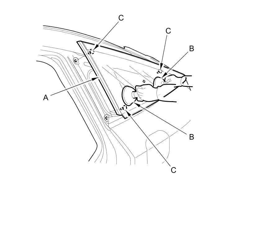 14. Hold the quarter glass (A) with suction cups (B) over the opening, align it with the clips (C), and set it down on the adhesive. Lightly push on the quarter glass until its edges are fully seated on the adhesive all the way around.