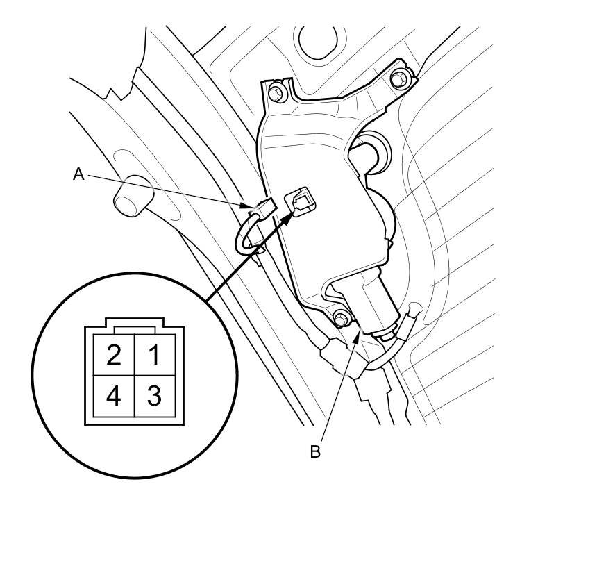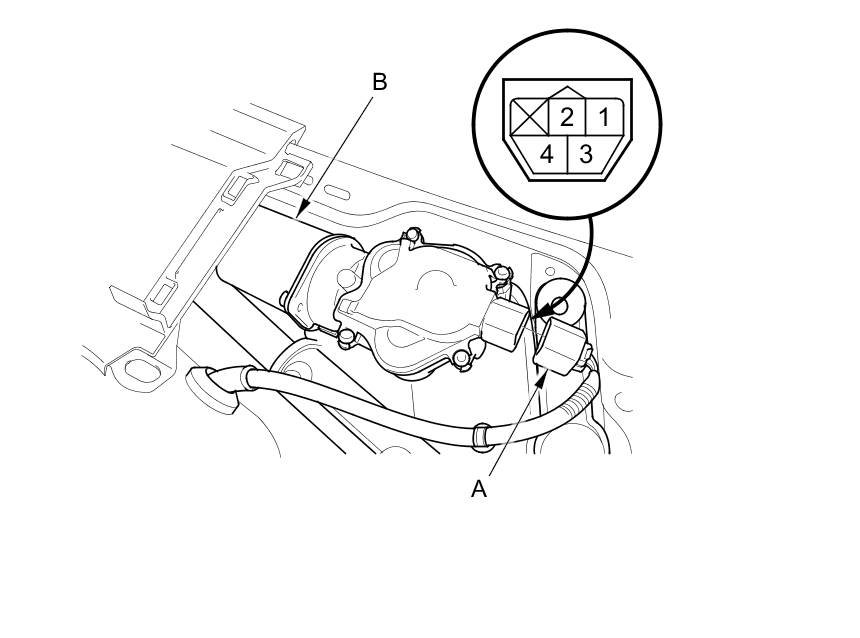 3. Disconnect 4P connector (A) from the windshield wiper motor (B).