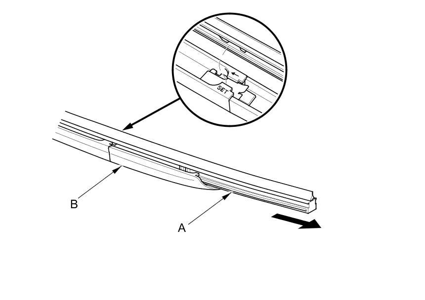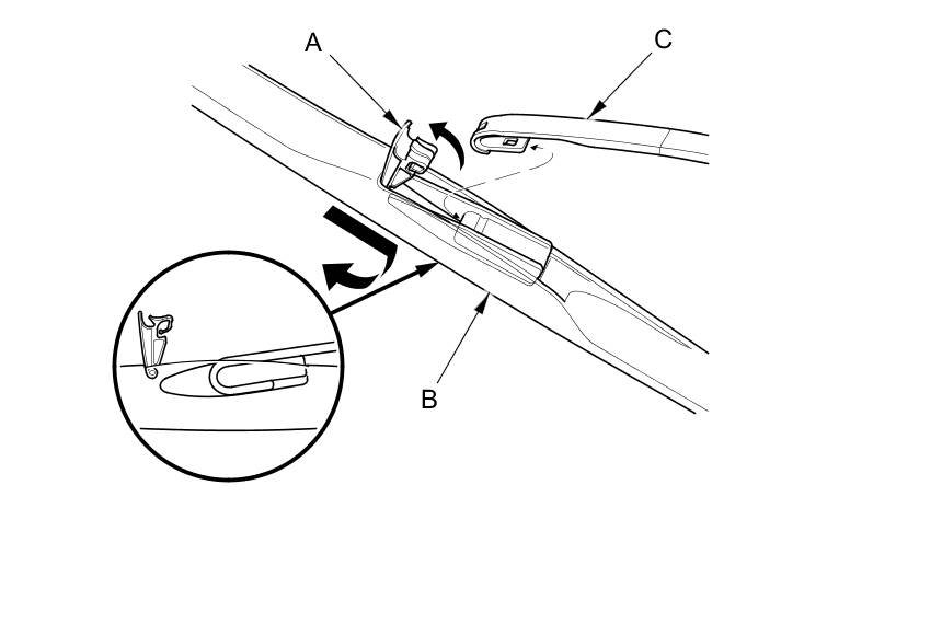 2. Pull up and hold the tab (A), and slide the wiper blade assembly (B) toward the tabs until it releases from the wiper arm (C).