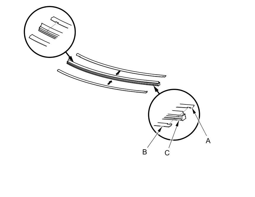 1. Align the groove (A) on each rail (B) and a new blade (C).