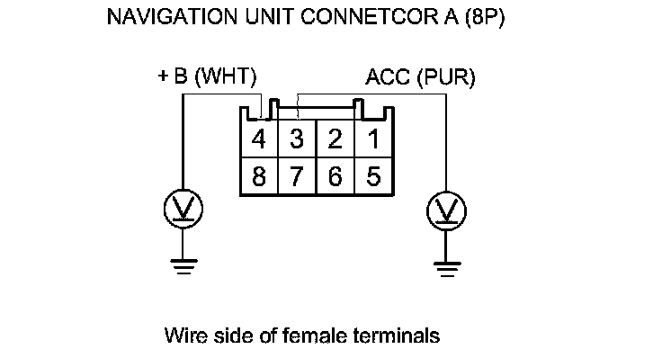 2. Measure the voltage between body ground and navigation unit connector A (8P) terminals No. 3 and No. 4 individually.
