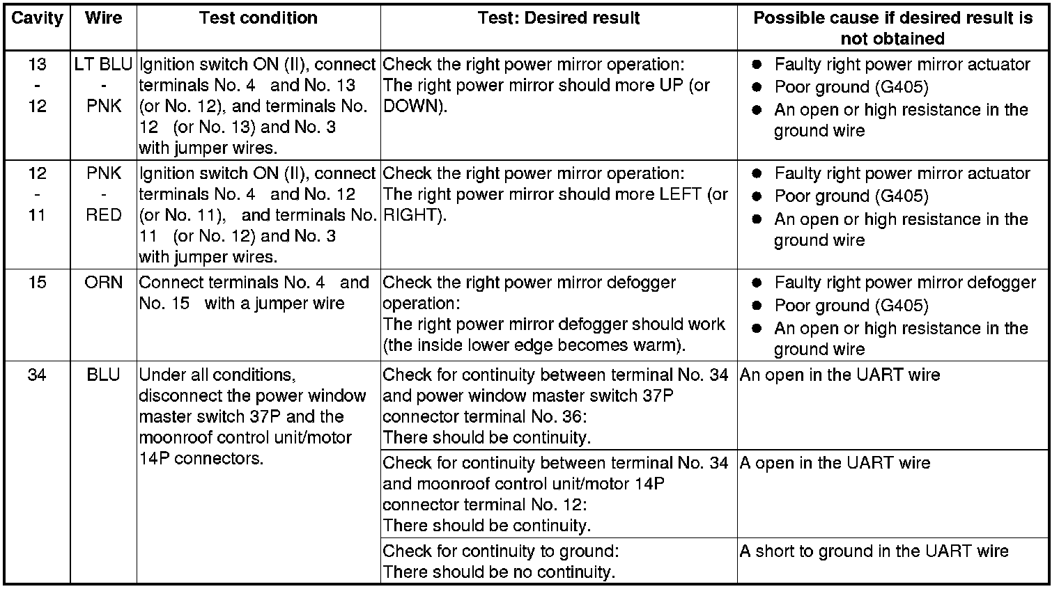 6. Reconnect the connector to the front passenger's power window switch, and do the following input tests: