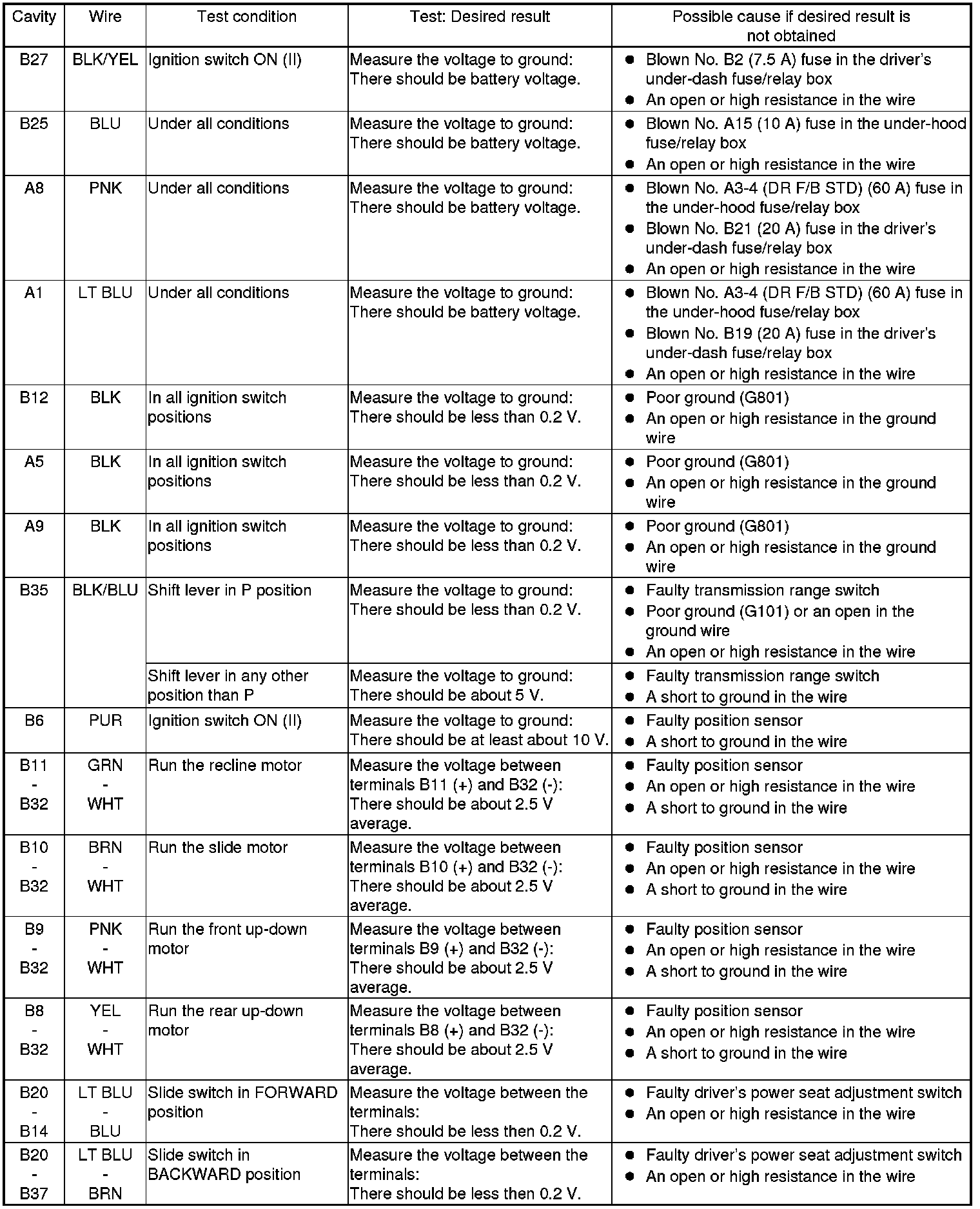 6. Turn the ignition switch to LOCK (0), then disconnect the connectors from the power seat control unit, and do the following input tests: