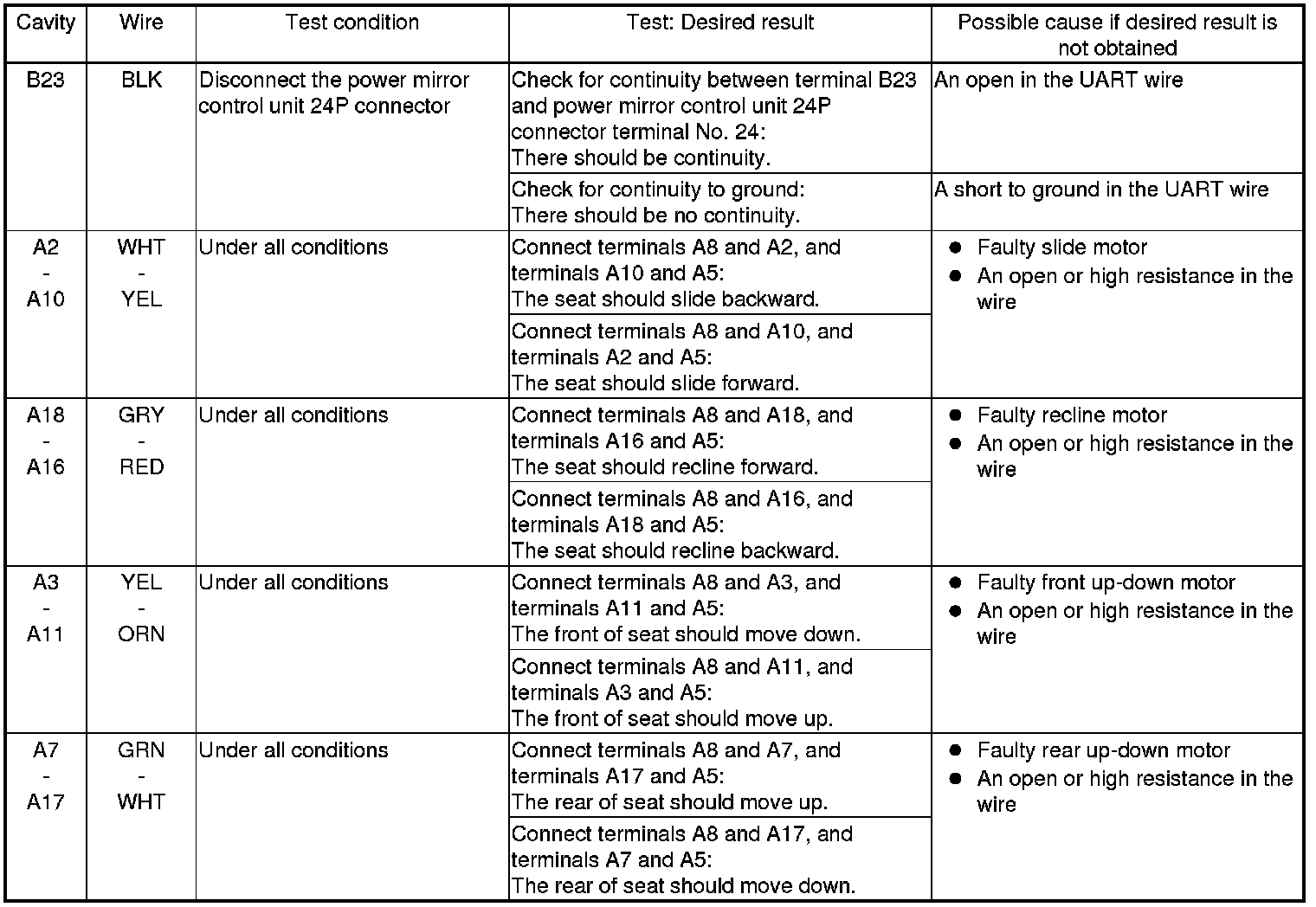 5. Reconnect the connectors to the power seat control unit, and do the following input tests: