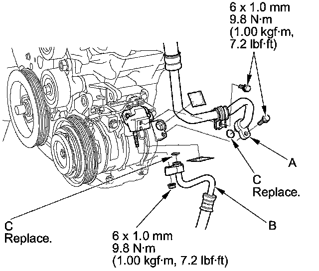 5. Remove the bolts and the nut, then disconnect the suction hose (A) and the discharge hose (B) from the A/C compressor. Remove the O-rings (C). Plug or cap the lines immediately after disconnecting them to avoid moisture and dust contamination.
