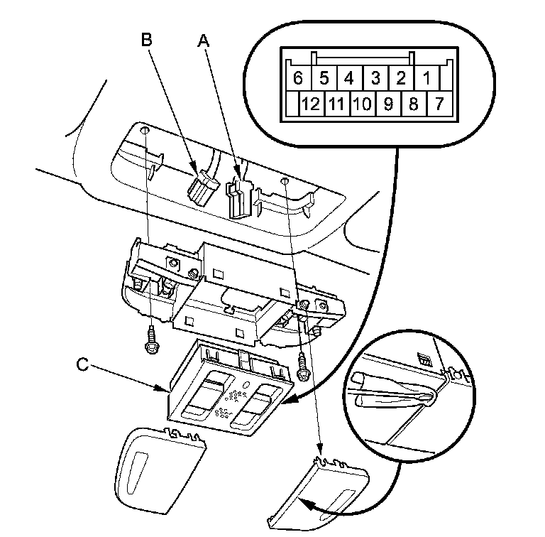2. Disconnect the moonroof switch 12P connector (A) and the map light 3P connector (B).