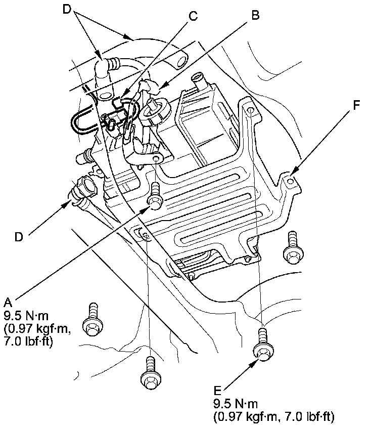 2. Remove the bolts (E), and move the EVAP canister assembly (F) to the rear.