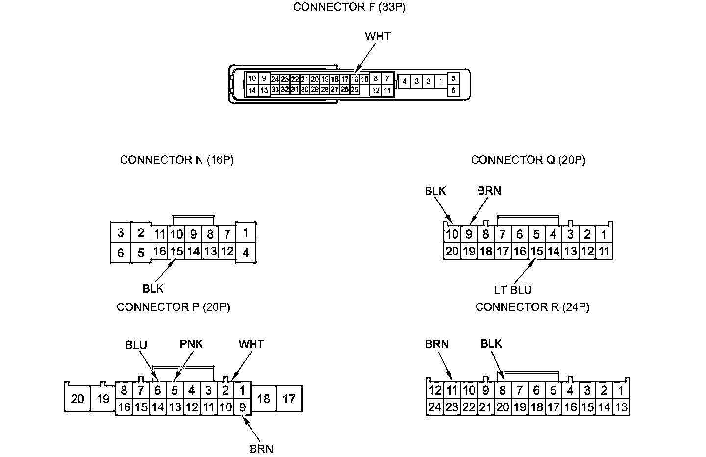 3. Disconnect driver's under-dash fuse/relay box connectors F, N, P, Q, and R.