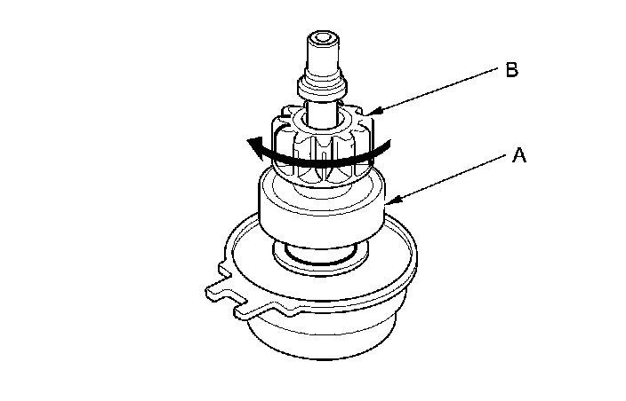 14. Hold the overrunning clutch (A), and turn the drive gear (B) in the direction shown to make sure it turns freely. Also make sure the drive gear locks in the opposite direction. If it does not lock, replace the overrunning clutch assembly.