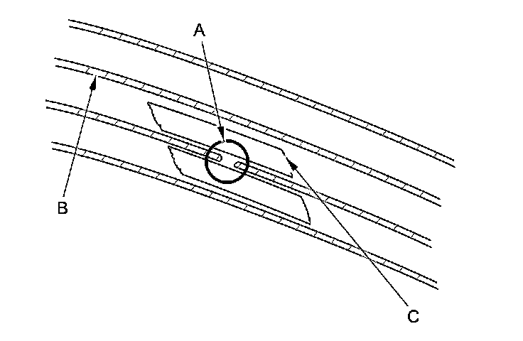 2. Carefully mask above and below the broken portion of the defogger wire (B) with cellophane tape (C).