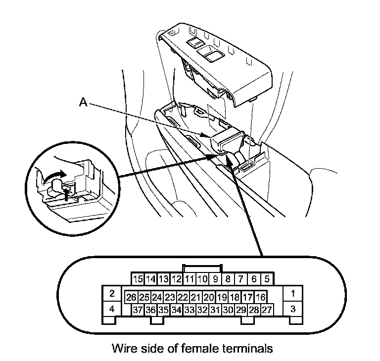 2. Test the motor in each direction by connecting battery power and ground to the front passenger's power window switch 37P connector (A) according to the table.