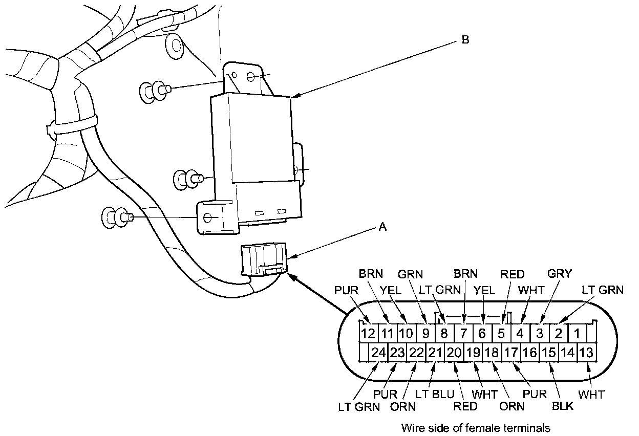 3. Disconnect the 24P connector (A) from the power mirror control unit (B).