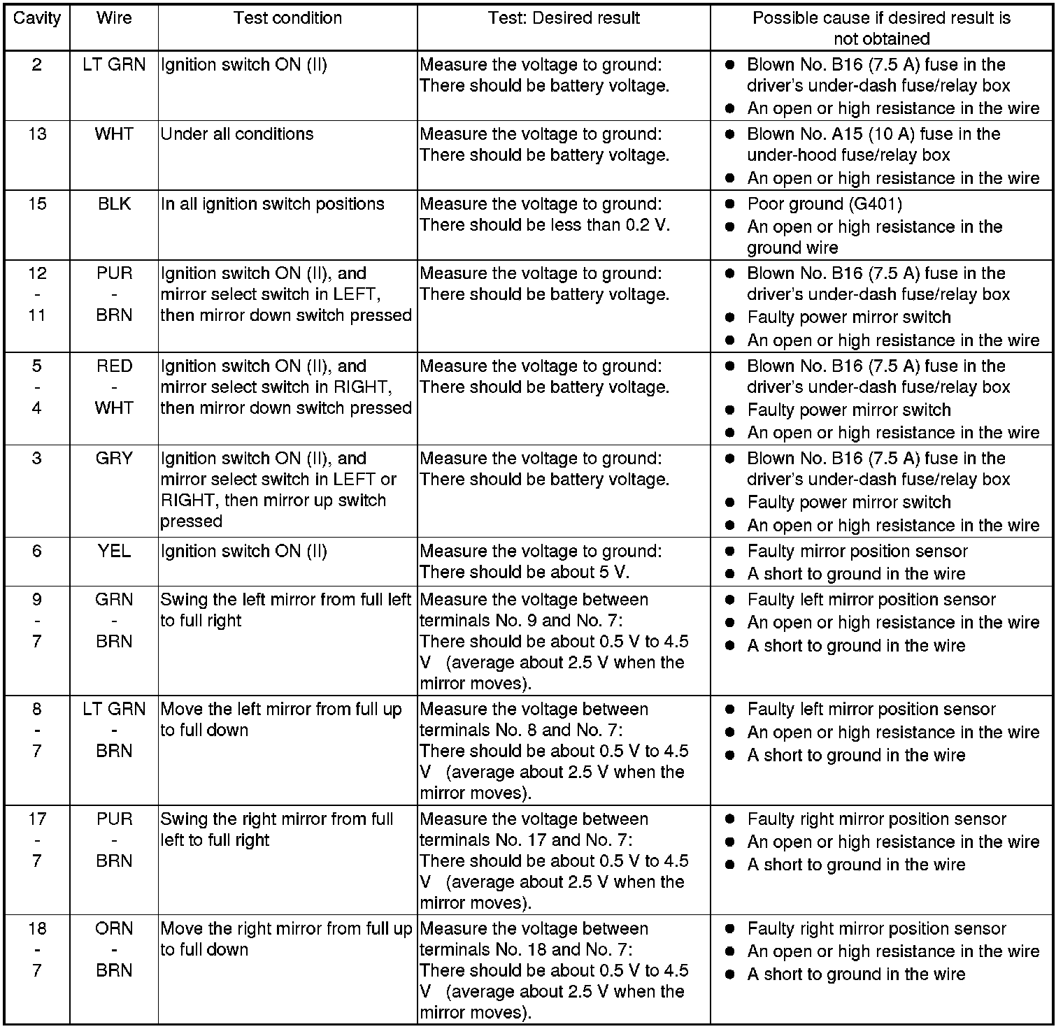 6. Turn the ignition switch to LOCK (0), then disconnect the connectors from the power mirror control unit, and do the following input tests: