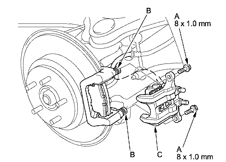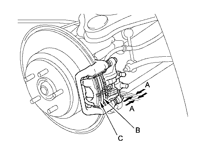 Verify that the caliper pins (C) move in and out smoothly. Clean and lube if needed.