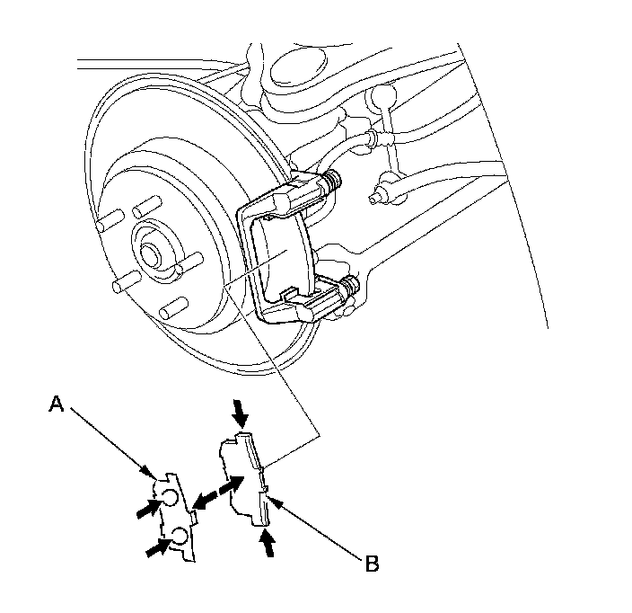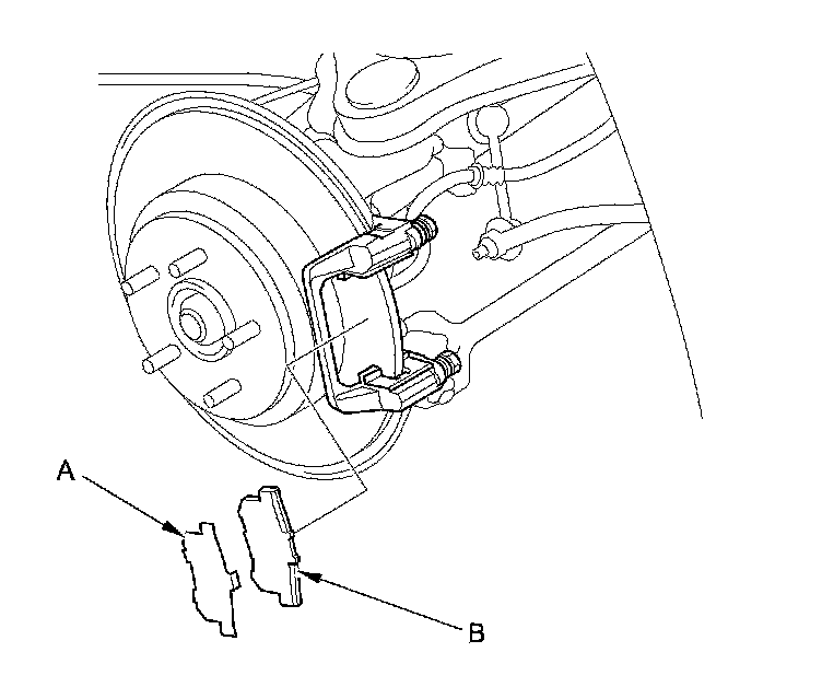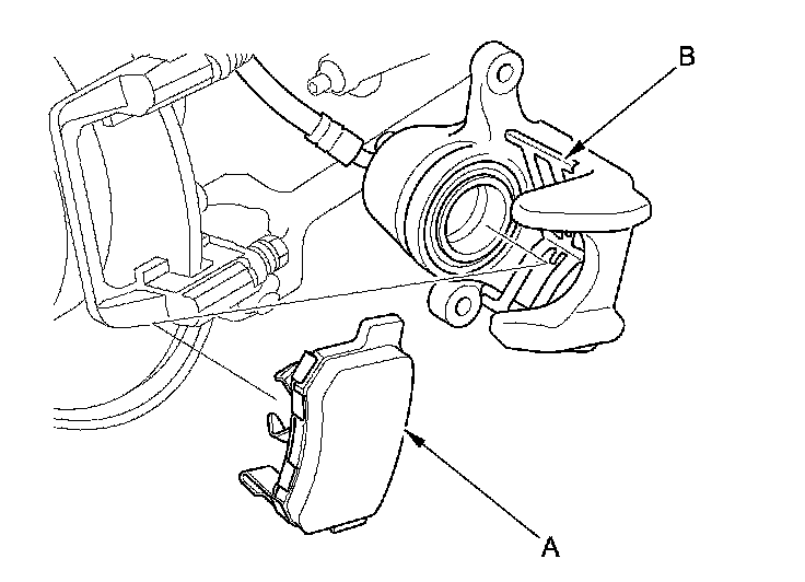 5. Remove the outer pad shim (A) and the outer brake pad (B).