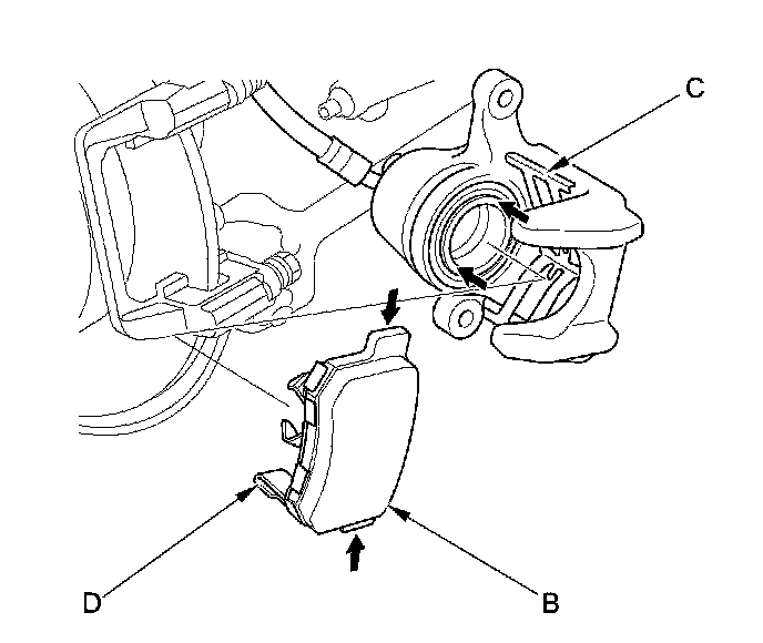 16. Install the brake pads, pad shim, and pad spring (C) correctly. Install the brake pad with the wear indicator (D) on the bottom inside position. If you are reusing the brake pads, always reinstall the brake pads in their original positions to prevent a temporary loss of braking efficiency.
