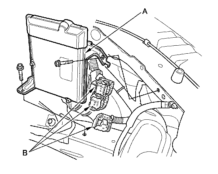 13. Remove the PCM with the bracket (A), then disconnect the PCM connectors (B).