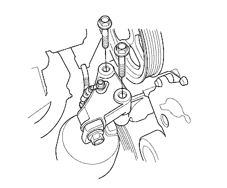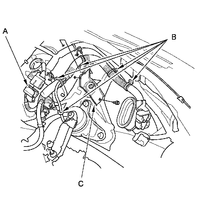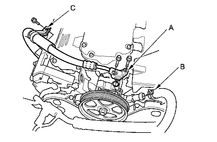 19. Disconnect the power steering pump outlet line (A) and the power steering pump inlet line (B) from the power steering pump and remove the power steering hose bracket (C), then plug the lines and the power steering pump.