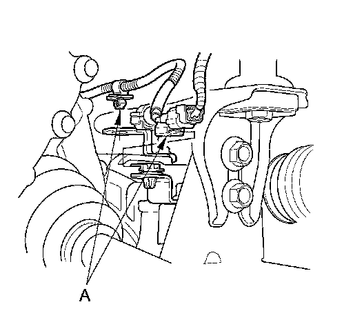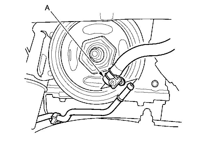 37. Disconnect the power steering fluid hose (A). Turn end of the hose up to prevent power steering fluid from flowing out, then plug the line and the hose.