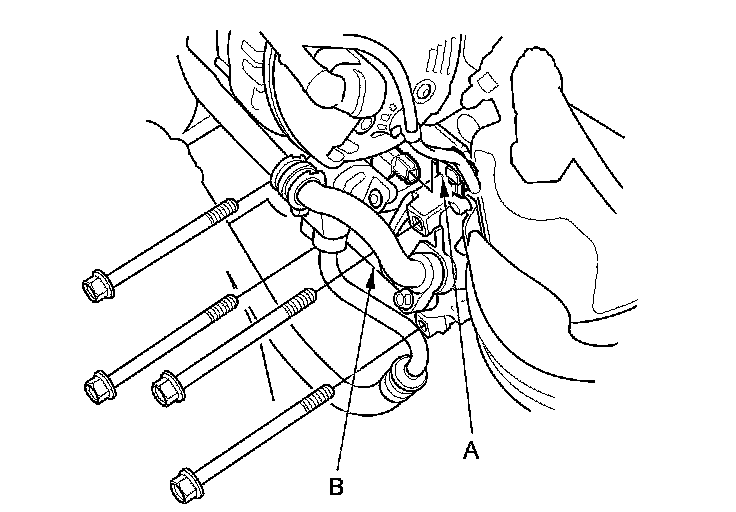 45. Remove the connector bracket (A) from the front cylinder head; use the bracket bolt hole (B) to attach the engine hanger balance bar front arm.