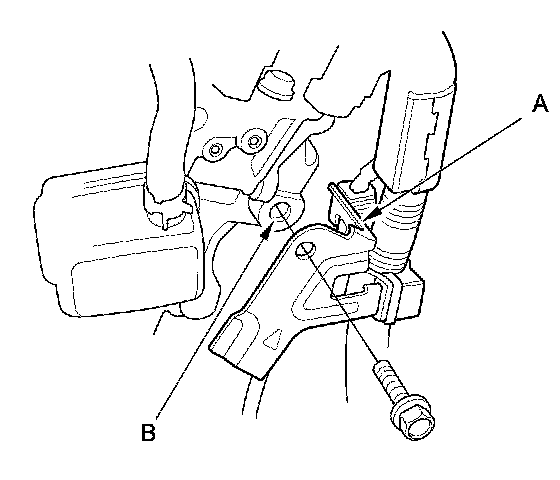 2. Remove the driver's side hood support strut bracket (A), then use it as shown to prop the hood in the wide-open position.