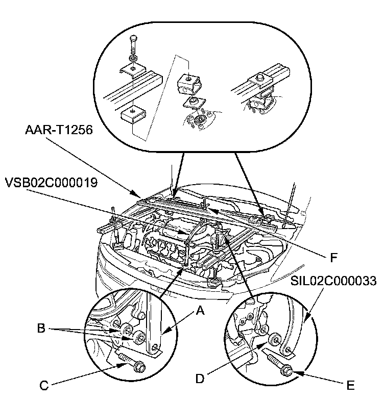 48. Install the engine support hanger (AAR-T1256) onto the vehicle as shown, and attach the hook to the slotted hole in the engine hanger balance bar. Tighten the wing nut (F) by hand, and lift and support the engine/transmission.