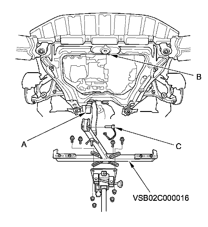 53. Attach the subframe adapter (VSB02C000016) to the front subframe by looping the belt (A) over the front of the front subframe (B), then secure the belt with its stop (C).