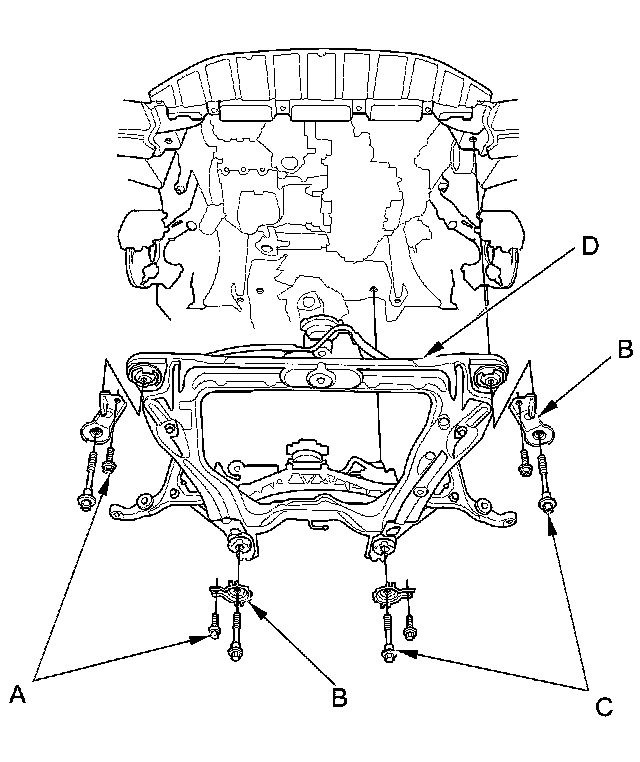 49. Remove the front engine mount stop (A), then remove the front engine mount bolt (B) and disconnect the engine mount actuator connector (C), and remove the connector (D) from the front subframe.