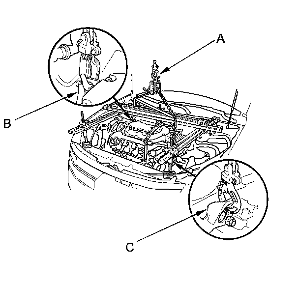59. Attach a chain hoist (A) to the engine hanger (B) and the transmission hanger (C), then lift the engine/transmission until it is securely supported by the chain hoist, and remove the engine support hanger and the engine hanger balance bar.