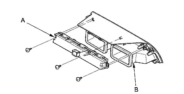 2. Remove the self-tapping screws and the audio-HVAC subdisplay unit (A) from the dashboard center vent (B).