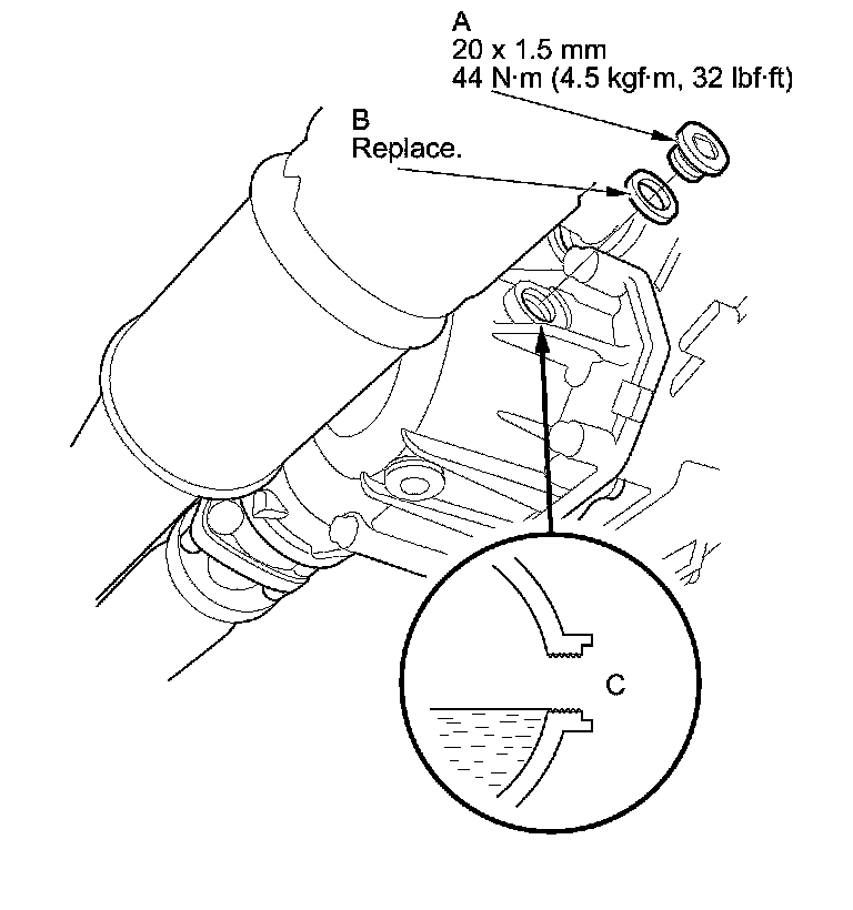 6. Refill the transfer assembly with the recommended fluid (hypoid gear oil) through the filler hole (C) until the fluid flows out. Use a SAE 90 viscosity hypoid gear oil, API classified GL4 or GL5 only.