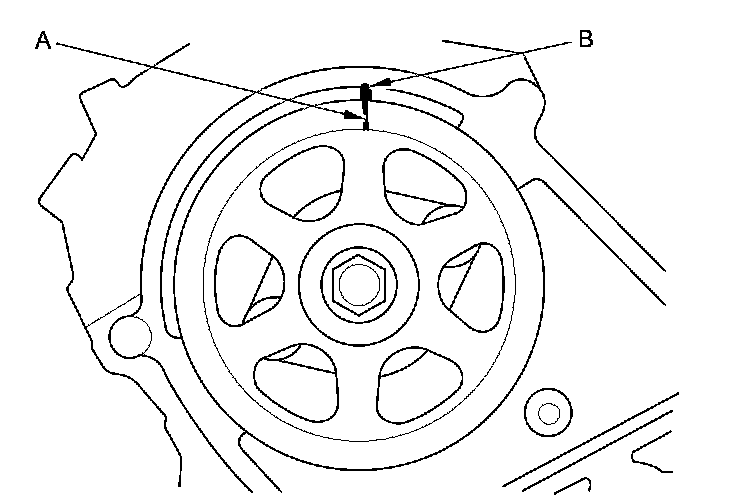 Set the timing belt drive pulley to top dead center (TDC) by aligning the TDC mark (A) on the tooth of the timing belt drive pulley with the pointer (B) on the oil pump.