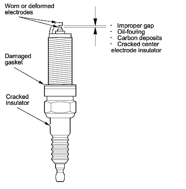 3. Replace the plug at the specified interval, or if the center electrode (A) is rounded, or if the spark plug gap (B) is out of specification, or if the spark plug electrode is dirty or contaminated. Use only the spark plugs listed.