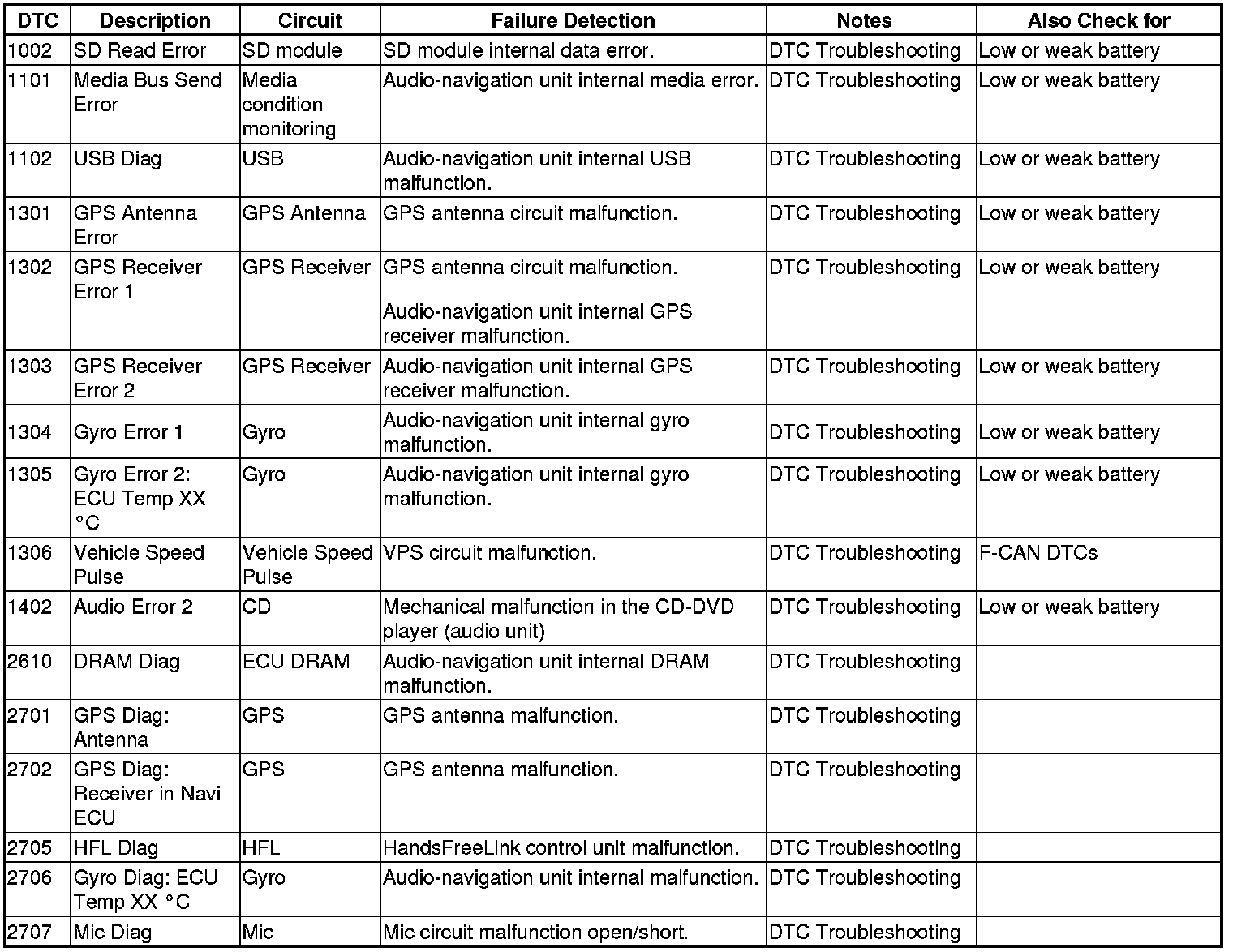 Navigation System DTC Troubleshooting Index