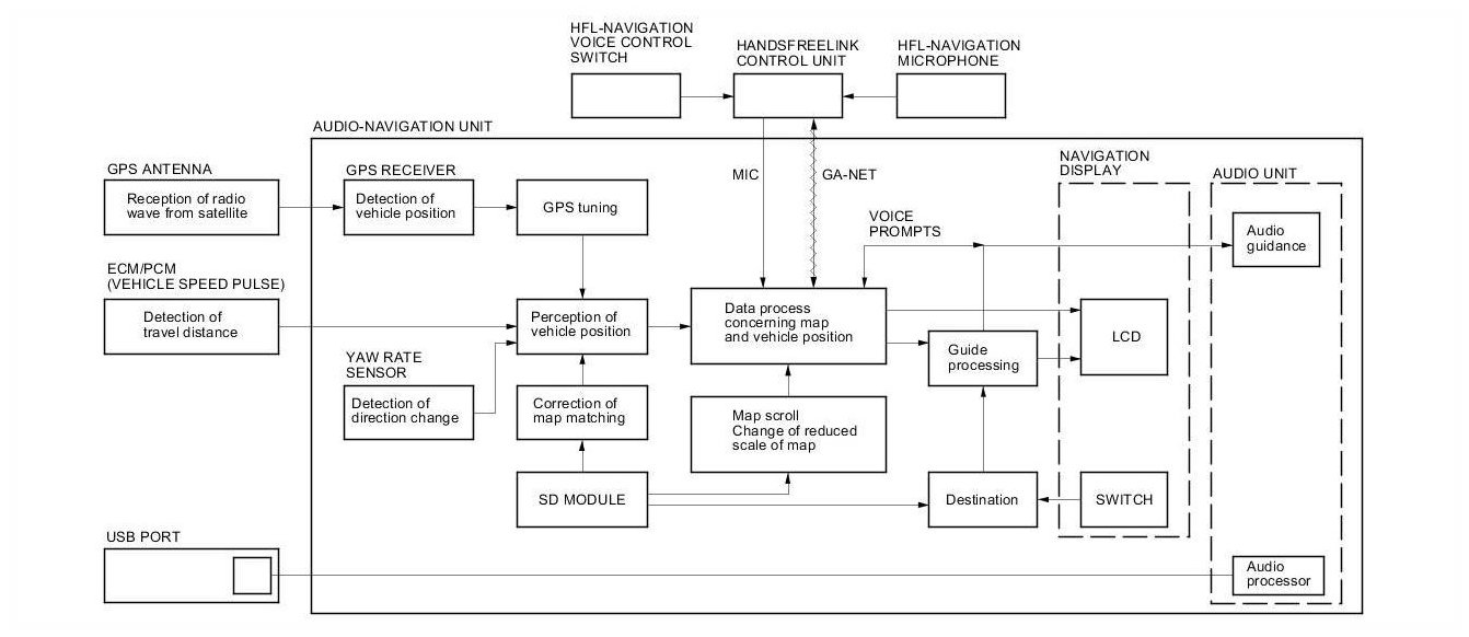 The audio-navigation unit calculates the vehicle position and guides you to the destination. The unit performs map matching correction, GPS correction, and distance tuning. It also controls the menu functions and the SD module, and interprets voice commands. With control of all these items, the audio-navigation unit makes the navigation picture signal, then it transmits the signal to the display panel and audio driving instructions to the audio section of the audio-navigation unit.
