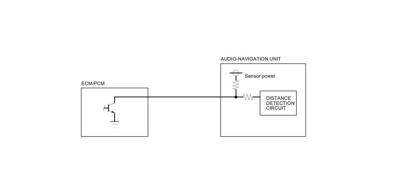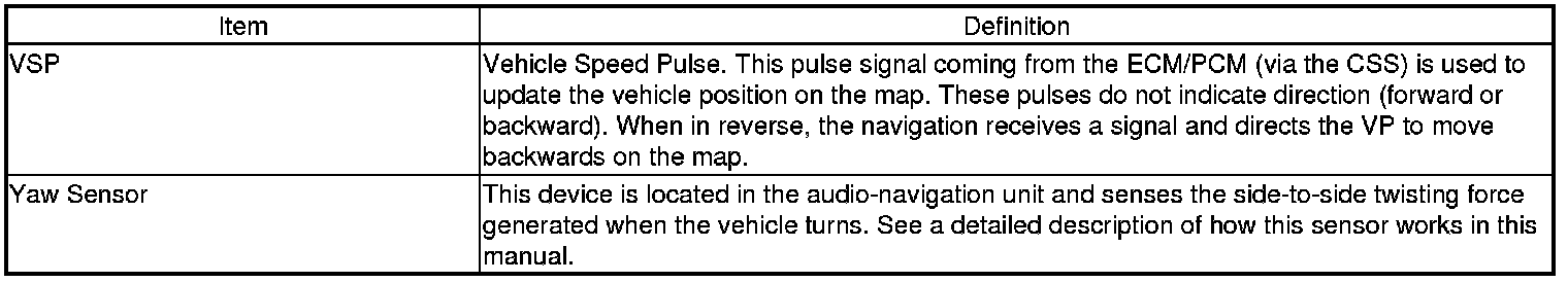 The audio-navigation unit calculates the vehicle position (the driving direction and the current position) by receiving the directional change signals from the yaw rate sensor and the travel distance signals from vehicle speed pulse (VSP) signal of the ECM/PCM.