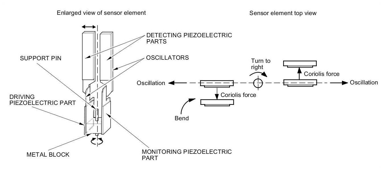 - When the vehicle turns to the right, the sensor element moves in a circular motion with the right oscillator bending forward and the left oscillator bending rearward. The amount of forward/rearward bend varies according to the angular velocity of the vehicle.