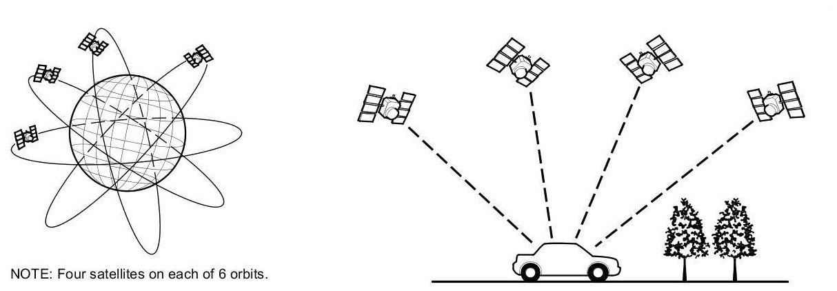 The global positioning system (GPS) enables the navigation system to determine the current position of the vehicle by using the signals transmitted from the satellites in orbit around the earth. The satellites transmit the satellite identification signal, orbit information, transmission time signal, and other information. When the GPS receiver receives a signal from four or more satellites simultaneously, it calculates the current position of the vehicle based on the distance to each satellite and the satellite's position in its respective orbit.