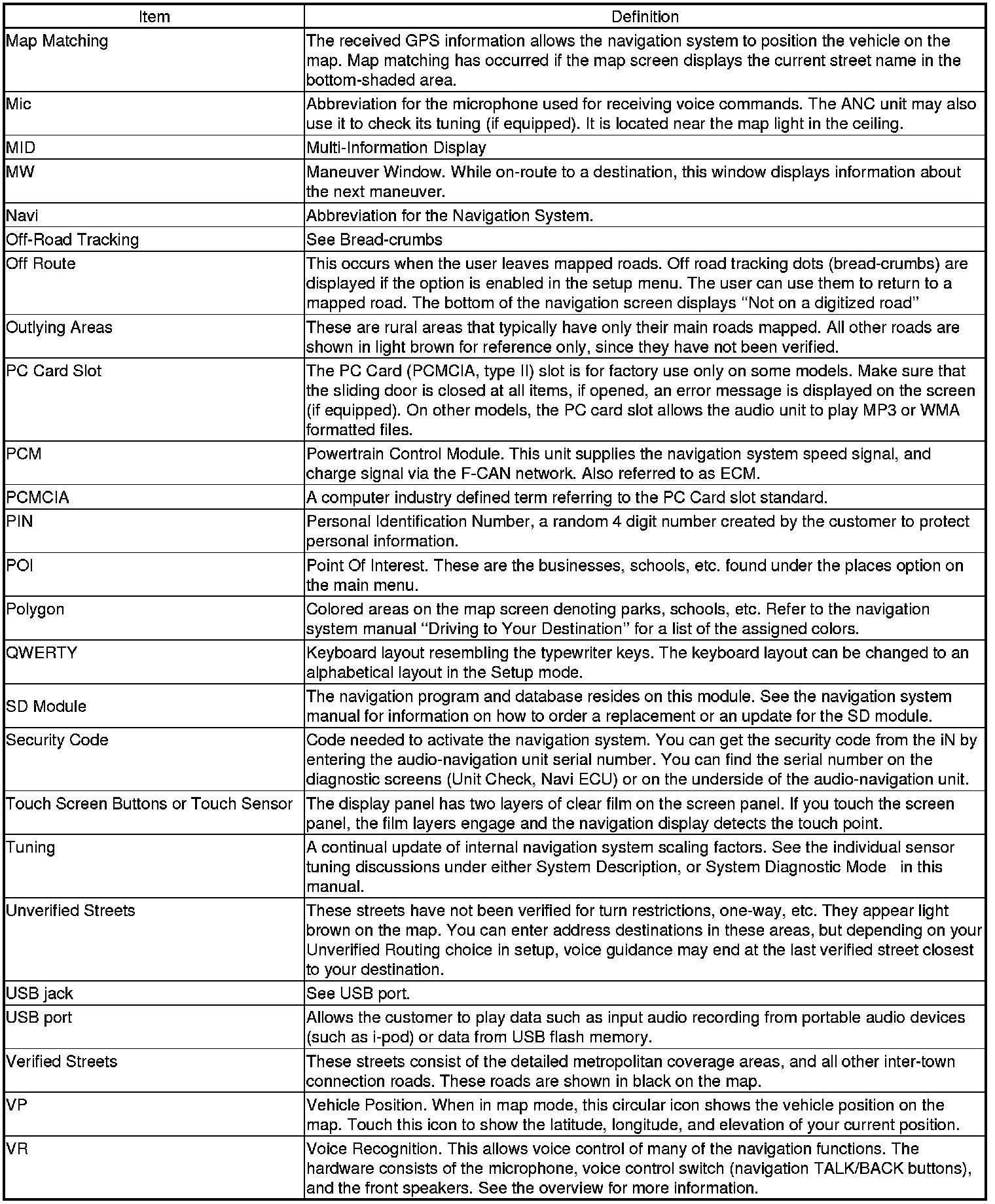 The following is a glossary of terms pertaining to the voice recognition navigation system. All items may not apply to this vehicle. See the navigation system manual for more information.
