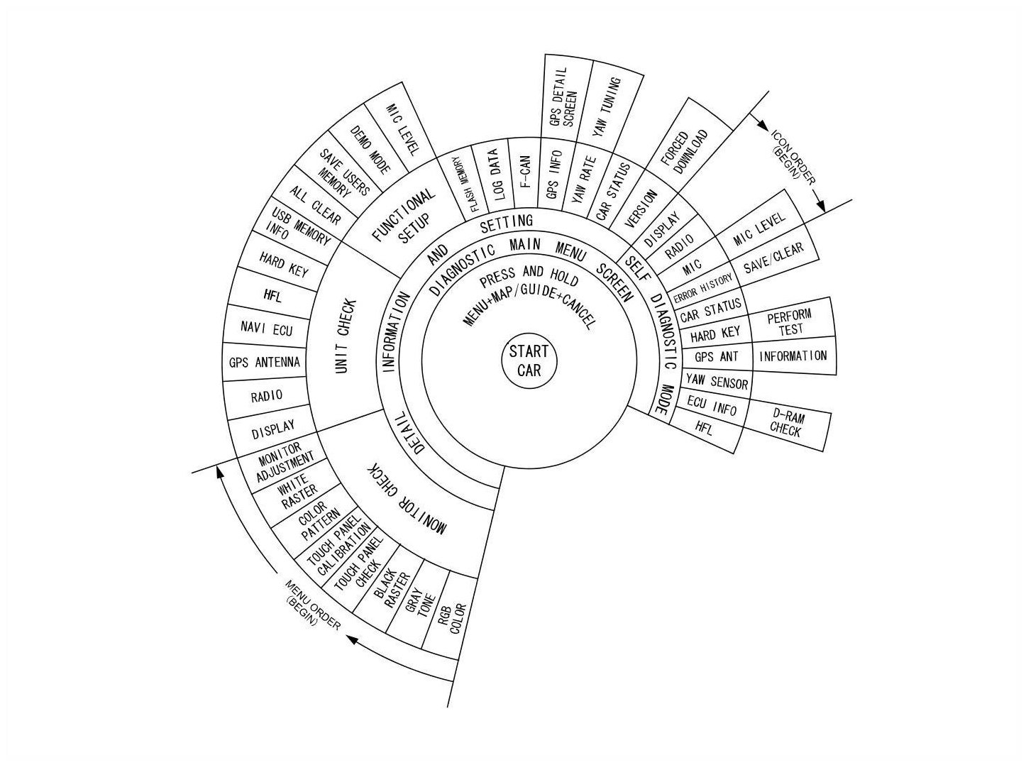 Access to the diagnostic features begins by starting the vehicle. This is necessary so the system can check the other systems connected by various busses. After starting the vehicle you can enter the diagnostic mode either by pressing and holding MENU + MAP/GUIDE + CANCEL.