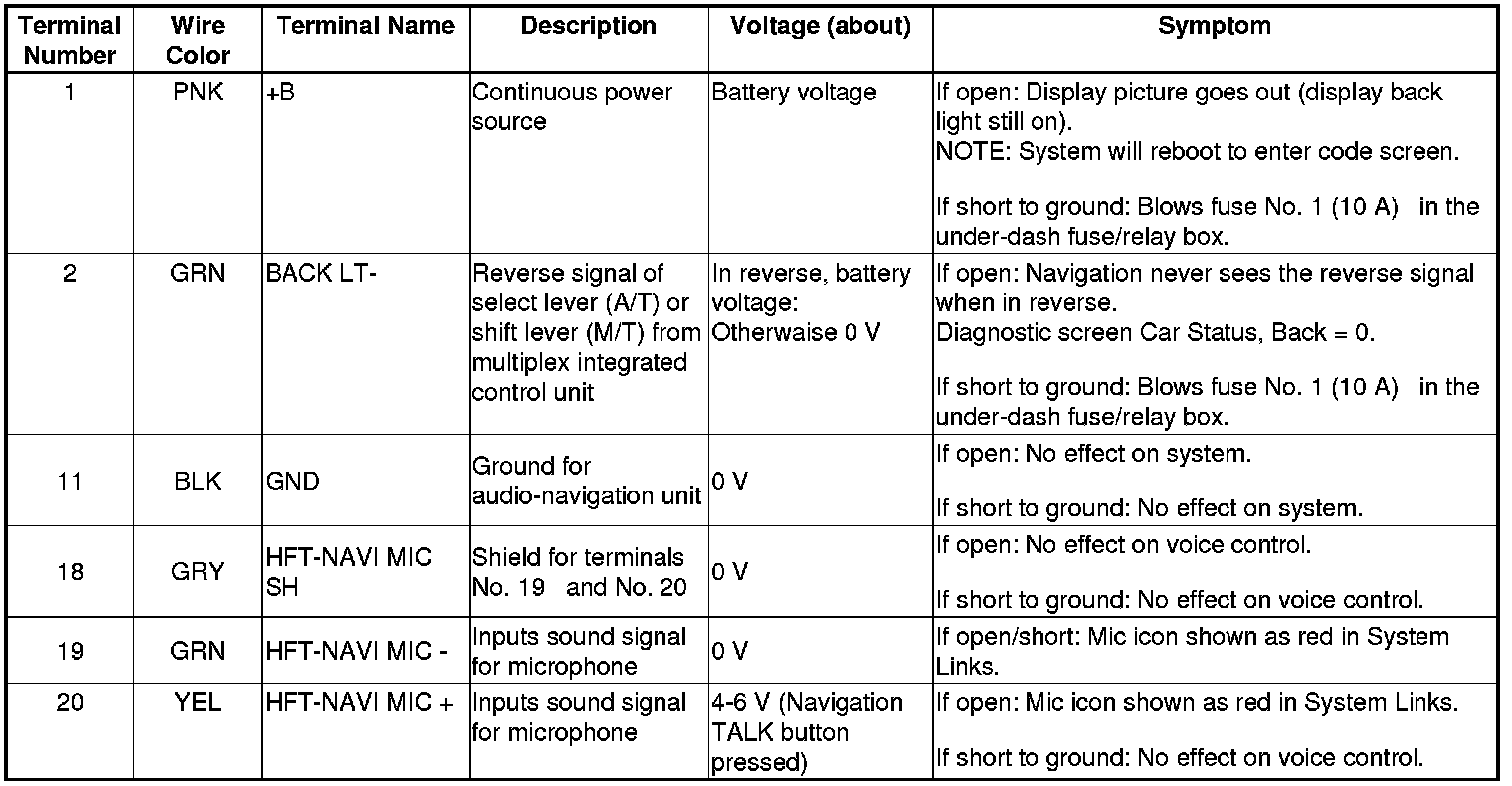 Audio-navigation Unit Inputs and Outputs for Connector D (20P)