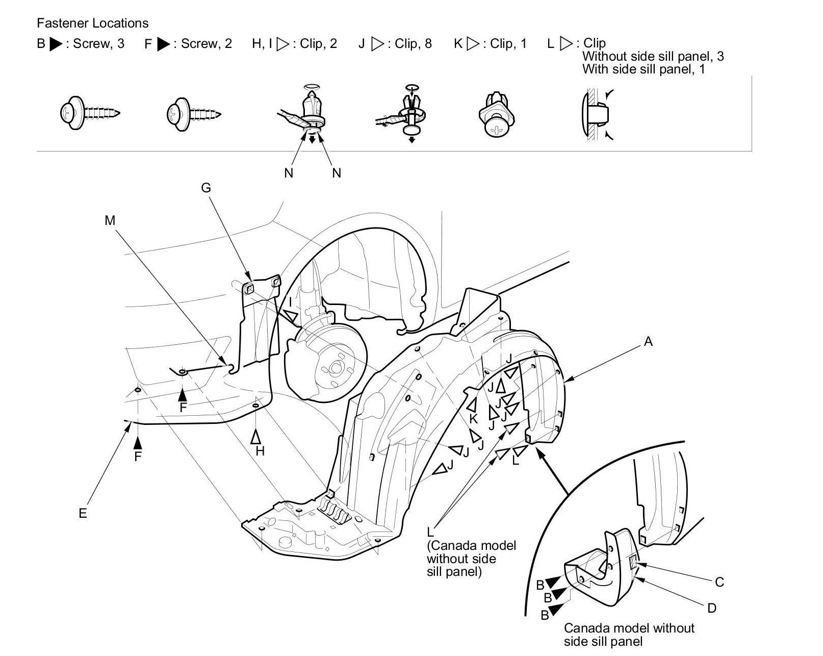 1. Canada model without side sill panels: On the back of the wheel arch, remove the screws (B), release the adhesive tape (C) from the body, and remove the front splash guard (D).