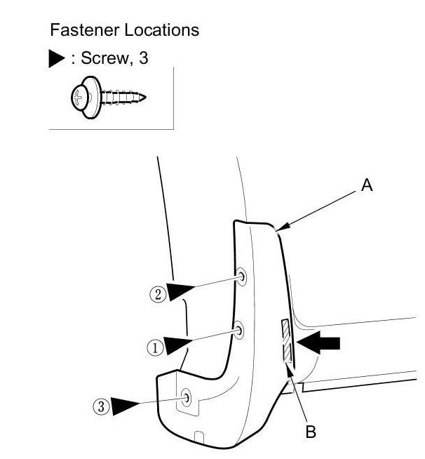 - Canada model without side sill panel: Fasten the front splash guard mounting screws in the sequence shown. Push the splash guard (A) against the body to make the adhesive (B) stick securely.