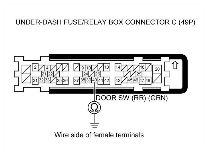 8. Check for continuity between under-dash fuse/relay box connector C (49P) terminal No. 40 and body ground.