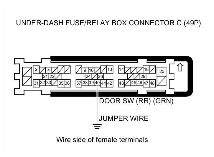 12. Connect under-dash fuse/relay box connector C (49P) terminal No. 40 and body ground with a jumper wire.